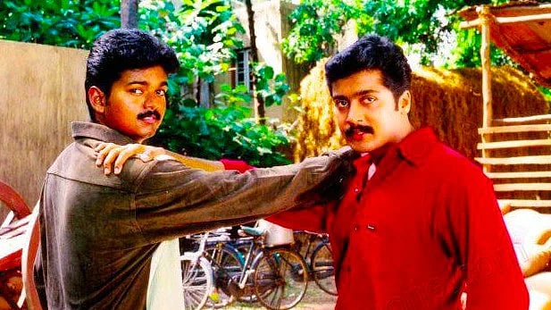 சூர்யா அப்போது ஒல்லியான தேகம் கொண்டவராக இருந்ததால் காஸ்ட்யூம்களில் பூசிய உடல்வாகு கொண்டவராக அவரைக் காட்ட மெனக்கெட்டனர். தோள்பட்டையில் 'பேட்' வைத்து தைத்த சட்டைகளை அணிந்து நடித்தார் சூர்யா. கூட நடித்த சிம்ரனுக்கு இது முதல் படம். பாலிவுட் இறக்குமதி வேறு. ஷூட்டிங் 'டிலே' ஆக சிம்ரனின் இரண்டு படங்கள் முந்திக் கொண்டது. ஷூட்டிங் சூர்யாவுக்கு சிம்ரனுடன் போட்டி போட்டு நடிக்கவும் சிரமமாக இருந்தது. விஜய்யுடன் மோதும் காட்சியில் கொஞ்சம் சமாளிக்க முடிந்ததற்குக் காரணம் ஏற்கனவே அவர்கள் இருவரும் கல்லூரி நண்பர்கள் என்பது தான்.