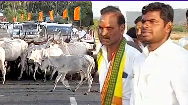 அண்ணாமலை பாதயாத்திரையை வழிமறித்த மாடுகள்.