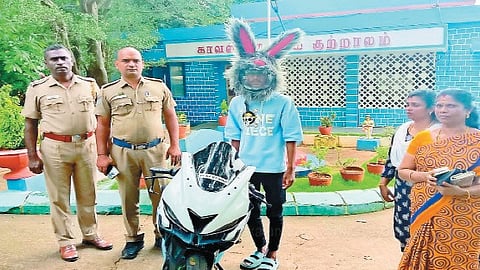 தென்காசி மாவட்டம் குற்றாலத்தில் கல்லூரி மாணவர் ஒருவர் பொம்மை ஹெல்மேட் அணிந்து இருசக்கர வாகனத்தில் வலம் வந்து சாலையில் செல்பவர்களை பயமுறுத்தியுள்ளார். இதனை அறிந்த காவல்துறை அந்த மாணவரை குற்றாலம் காவல்நிலையத்திற்கு அழைத்துச் சென்று பத்தாயிரம் ரூபாய் அபராதம் விதித்துள்ளனர்.